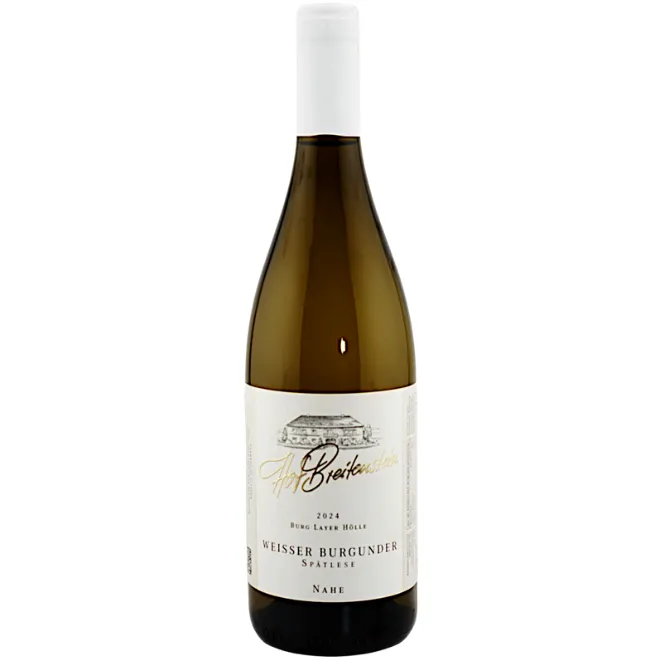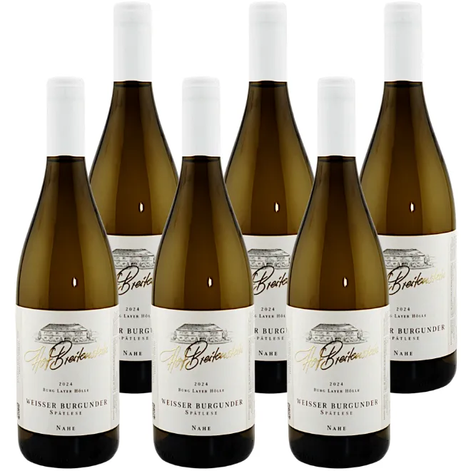 Die Weißer Burgunder Spätlese 2024 von Hof Breitenstein von der Nahe ist ein eleganter und raffinierter Wein, der spät geerntete Trauben mit dem frischen Stil der Region verbindet. Im Glas glänzt er mit einer hellen goldgelben Farbe und einem zarten Glanz. Dank der späten Lese entwickeln die Trauben eine besondere aromatische Intensität und reife Frucht, die diesem Wein einen besonders charmanten Charakter verleihen.