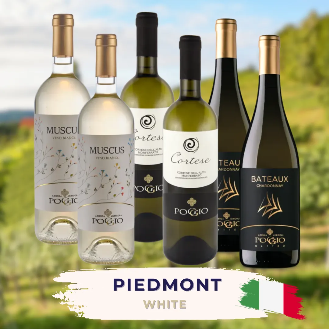 Discover six white wines from Piedmont in this Tasting Case. Piedmont, which literally means 'at the foot of the mountains' in Italian, is known for its famous wines as well as white wines. A rich combination from sweet dessert wine to a full-bodied Chardonnay.
