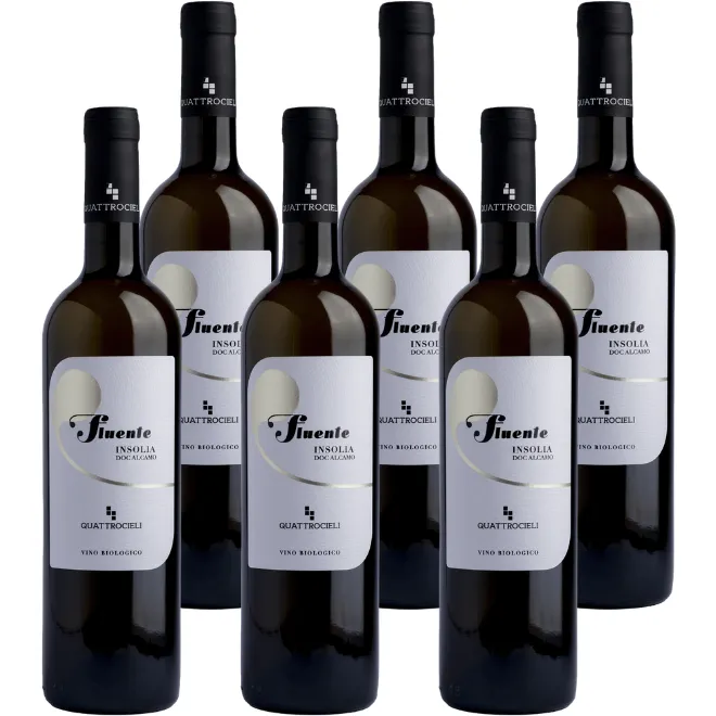 Fluente Insolia van Quattrocieli is een biologische witte wijn die de mediterrane ziel van Sicilië elegant tot uitdrukking brengt. Afkomstig uit de wijngaarden van Cozzo Amodeo in Gibellina, op 250 meter hoogte, groeit de Insolia hier op middelzware bodems onder de warme Siciliaanse zon en de verkoelende invloed van zee en wind. De druiven worden met de hand geoogst en zorgvuldig geselecteerd, waarna een zachte persing en gecontroleerde vergisting zorgen voor behoud van het natuurlijke karakter.