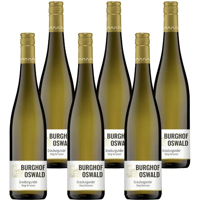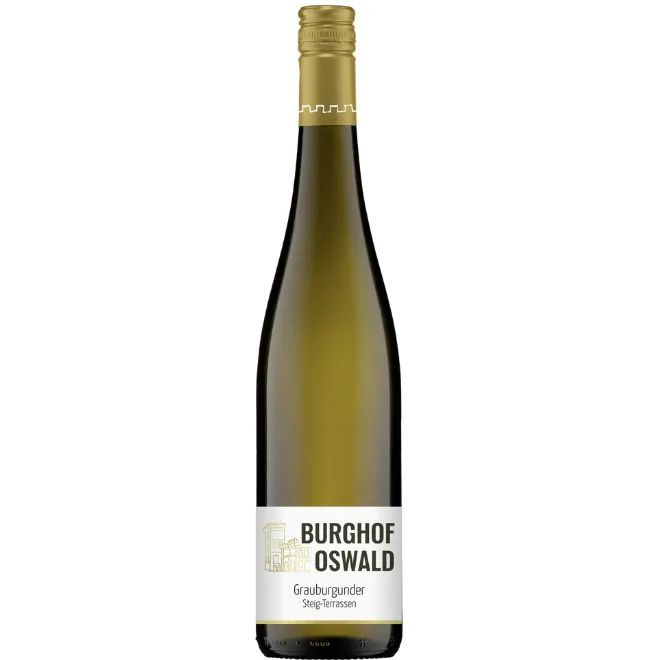 De Grauer Burgunder Steig-Terrassen Trocken van Weingut Burghof Oswald is een krachtige en verfijnde witte wijn afkomstig van de karaktervolle Steig-terrassen in Guntersblum. Deze wijn laat zien hoe concentratie, mineraliteit en elegantie samenkomen in een indrukwekkende Grauburgunder.