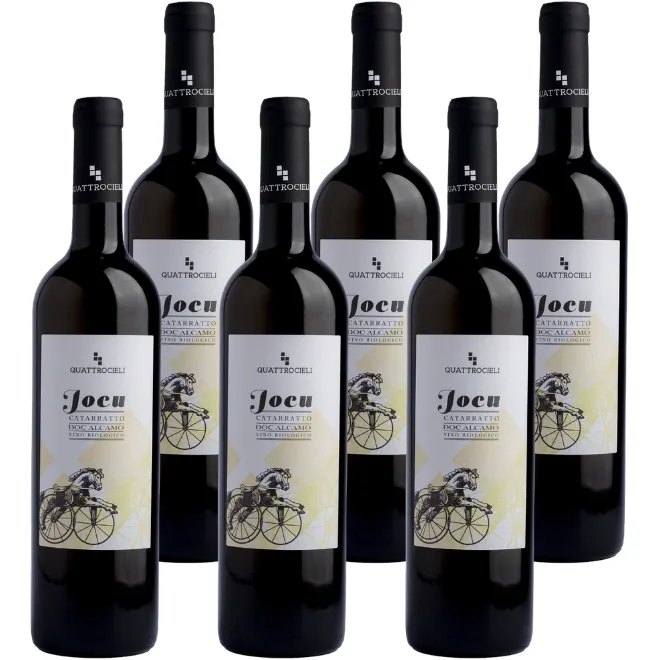 Jocu Catarratto van Quattrocieli is een biologische witte wijn die de traditie van Sicilië op pure en eigentijdse wijze vertolkt. Afkomstig uit de wijngaarden van Val di Bella in Alcamo, op 450 meter hoogte, groeit de Catarratto hier op zandige, kalkrijke bodems onder invloed van zon en zeewind. De druiven worden met de hand geoogst en streng geselecteerd, waarna ze zacht worden geperst en vergist bij gecontroleerde temperatuur om hun natuurlijke aromatische kracht te behouden.