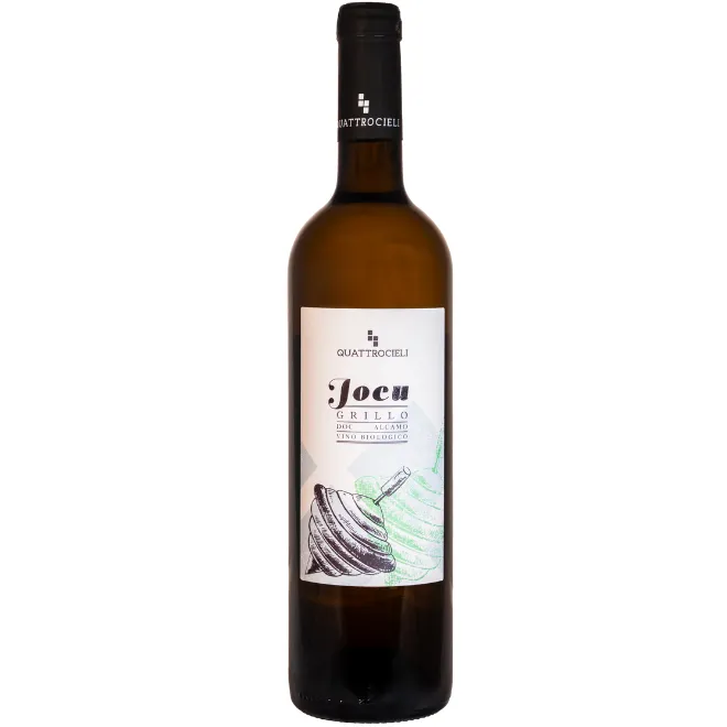 Jocu Grillo van Quattrocieli is een biologische witte wijn die de frisse ziel van West-Sicilië weerspiegelt. Afkomstig uit de wijngaarden van Val di Bella in Alcamo, op 450 meter hoogte, profiteert de wijn van zonovergoten dagen en verkoelende wind uit Trapani. De combinatie van kalkrijke zandbodems en zeebries geeft deze Grillo zijn levendige spanning en aromatische precisie. De druiven worden met de hand geoogst en streng geselecteerd, waarna ze zacht worden geperst en vergist bij lage temperatuur om het pure fruit te behouden.